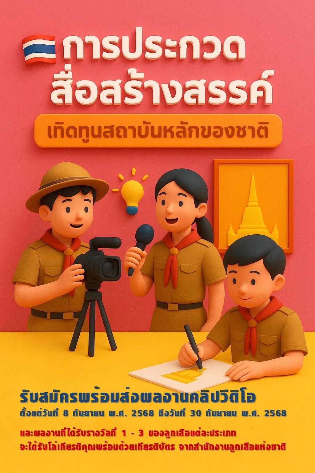 สำนักงานลูกเสือแห่งชาติ เปิดรับสมัครพร้อมส่งผลงานคลิปวีดิโอเข้าประกวด ตั้งแต่วันที่ 8 กันยายน พ.ศ. 2568 ถึงวันที่ 30 กันยายน พ.ศ. 2568